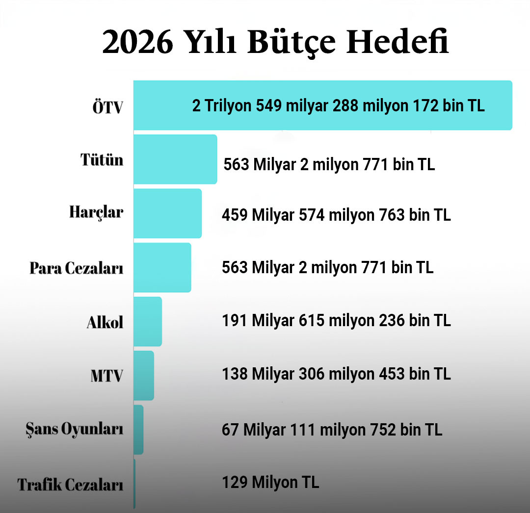 Bütçe teklifine göre, Özel Tüketim Vergisi (ÖTV) gelirlerinin 2026 yılında 2 trilyon 549 milyar 288 milyon 172 bin TL’ye ulaşması hedefleniyor. Motorlu Taşıtlar Vergisi (MTV)’nden ise 138 milyar 306 milyon 453 bin TL gelir bekleniyor.