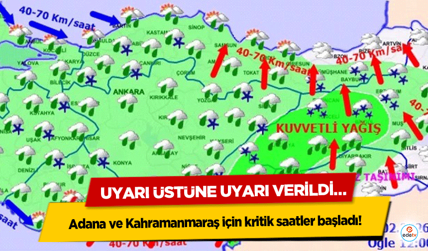 Yağışların İç Anadolu’nun güneyi, Doğu Anadolu’nun batısı, Güneydoğu Anadolu’nun batı kesimleri ile Orta ve Doğu Akdeniz’de kuvvetli olması bekleniyor. Özellikle Adana’nın kuzeyi ile Kahramanmaraş’ın batı çevrelerinde yağışların çok kuvvetli ve yer yer şiddetli olacağı tahmin ediliyor. Yetkililer ani sel, su baskını, yıldırım ve ulaşımda aksamalar gibi risklere karşı vatandaşların dikkatli olmasını istedi.