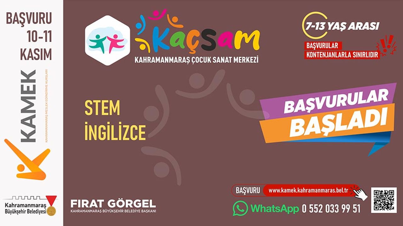 Kahramanmaraş Büyükşehir Belediyesi, sosyal belediyecilik anlayışı doğrultusunda toplumun tüm kesimlerine yönelik kültürel ve eğitsel faaliyetlerini artırarak sürdürüyor. Bu kapsamda bünyesinde faaliyet gösteren Çocuk Sanat Merkezi’nde (KAÇSAM) çocuklara yönelik ücretsiz kurslar için yeni dönem kayıtları başladı.