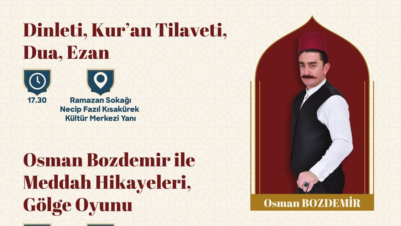 19 Şubat Perşembe saat 20.30’da meddahlık sanatını, modern dramayla harmanlayarak sahnelediği oyunlarla tanınan Osman Bozdemir, meddah hikayeleri ve gölge oyunu ile vatandaşlarla bir araya gelecek. Ramazan geleneği olan meddah ve gölge oyunu ile çocuklar başta olmak üzere tüm vatandaşlara keyifli anlar yaşatacak. Büyükşehir Belediyesi tarafından yapılan açıklamada, Ramazan ayı boyunca gerçekleştirilecek tüm etkinliklerin ücretsiz olduğu ve vatandaşların programlara davetli olduğu ifade edildi.
