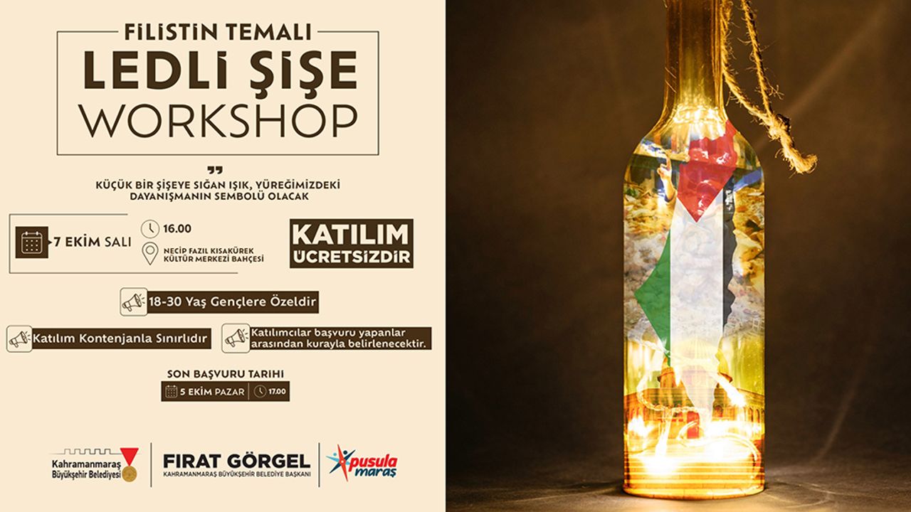 Etkinliğe katılmak isteyen gençler, https://kahramanmaras.bel.tr/duyuru/2025/10/01/filistin-temali-ledli-sise-workshop-basvuru-formu internet adresindeki başvuru formunu doldurarak kayıt yaptırabilecek. Son başvuru tarihi 5 Ekim Pazar.