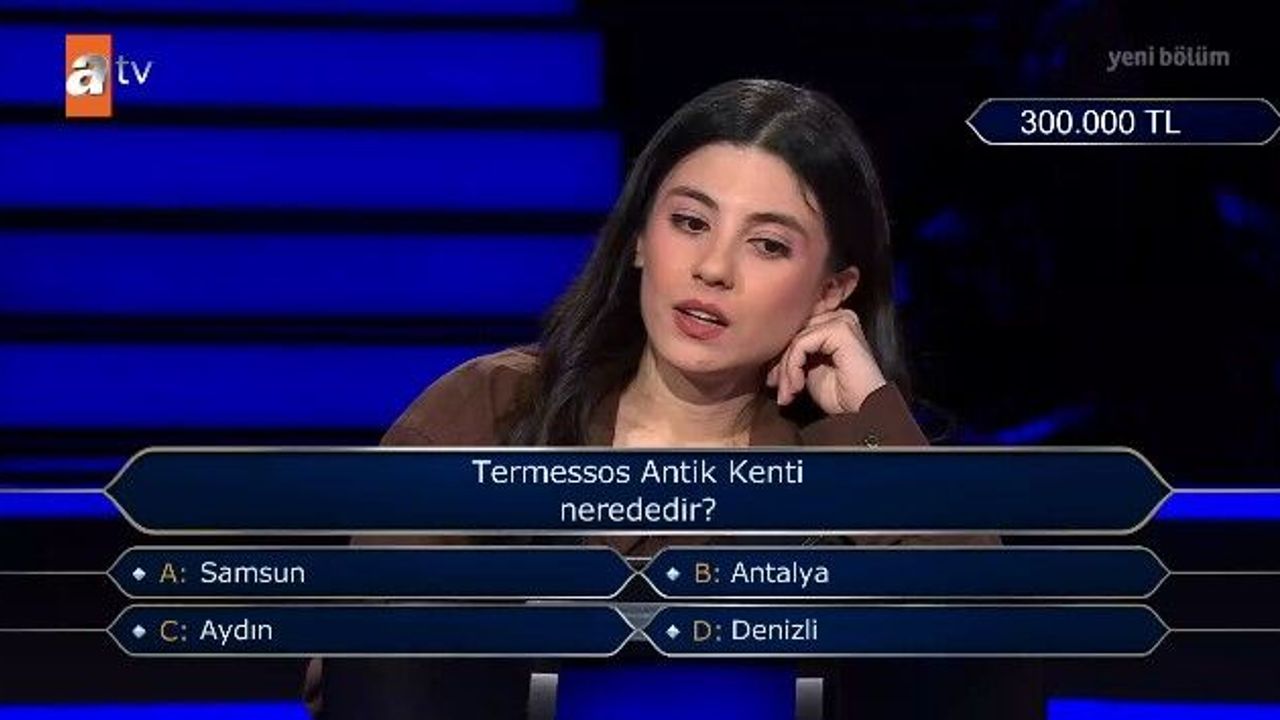 Programın son bölümünde yarışmacı, tarih ve coğrafya bilgisini ölçen zorlu bir soruyla karşı karşıya kaldı. "Termessos Antik Kenti nerededir?" sorusu üzerine yarışmacı bir süre düşündü. Seçenekler arasında ise şu iller yer aldı: